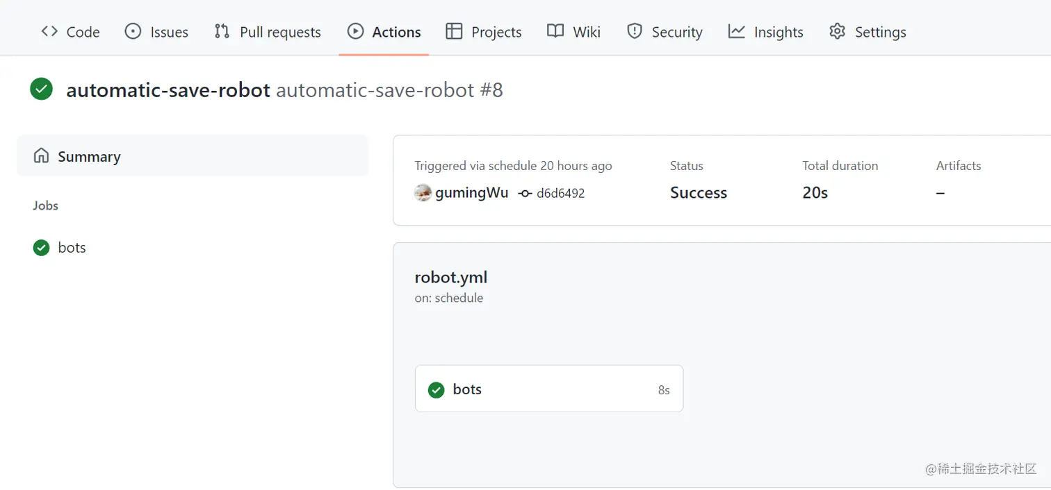 将上述的步骤都提交之后,就能每天蹲点你定的时间来看是否有触发定时任务,比如我定的时间是cron: "0 0 * * *",GitHub的时间是GMT时间,国内的北京时间是GMT+8,也就是中国会比Github的服务器快8个小时,所以是每天的早上8点执行定时任务