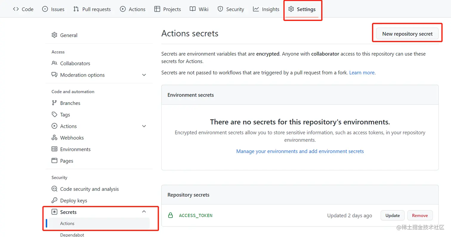 Setting,选择左侧菜单的Secrets-Actions,点击New repository secret创建环境变量 - 注意,这个环境变量的命名是在配置中写的命名,比如我的环境变量名叫