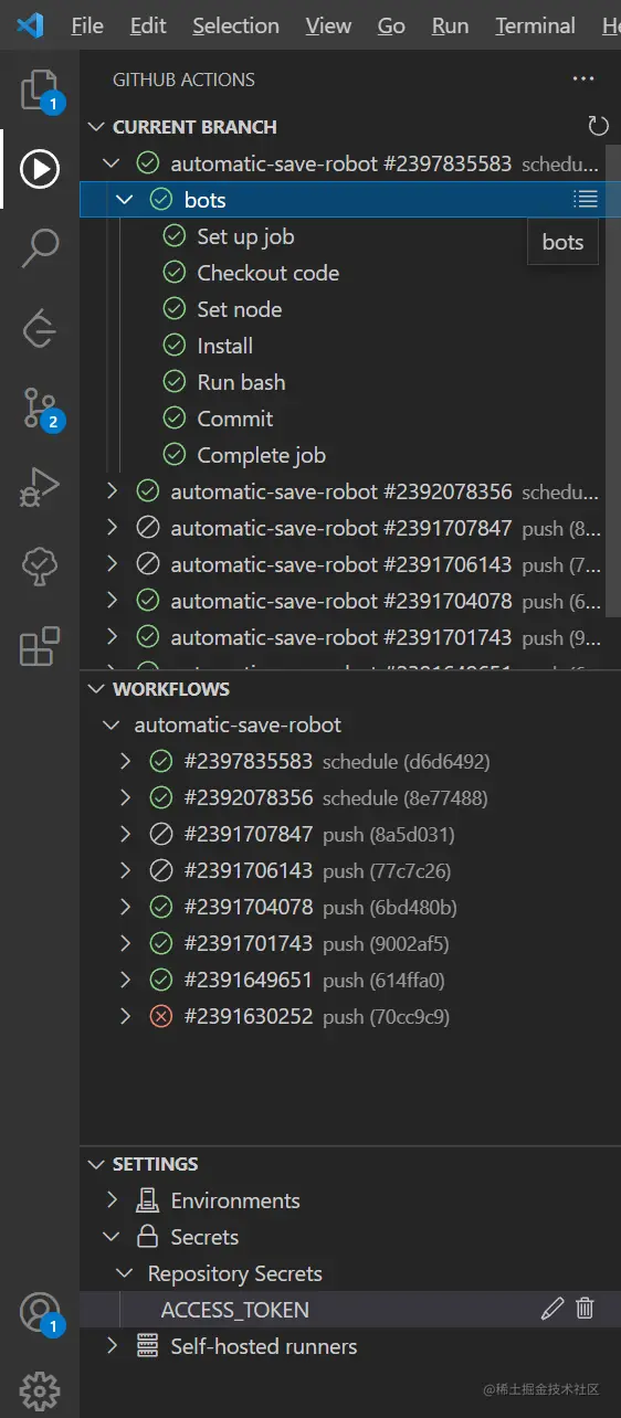 如果你是使用vscode开发,也可以安装插件Github Actions,能在左侧菜单就能看到actions的执行记录
