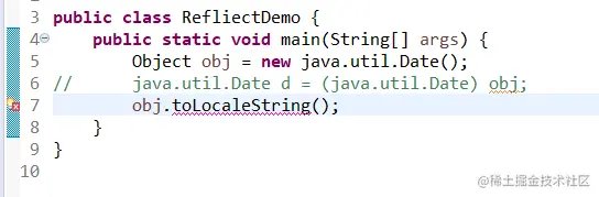 先提两个概念,第五行代码中等号左边的Object是编译类型,等号右边的java.util.Date是运行类型。假设有这么一个需求,我要用第四行的obj对象调用java.util.Date类中的toLocaleString方法。