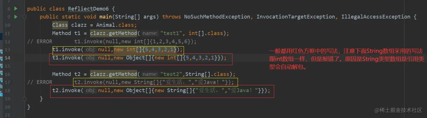 - 调用方法的时候把实际参数统统作为Object数组的元素即可.
