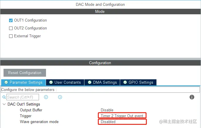 Timer 2/4/5/6/7/8 Trigger Out event定时器触发,利用这种方式可以输出特定的波形。在这里我们选择定时器2。Software trigger软件触发,在本模式下,向 DAC_SWTRIGR 寄存器写入配置即可触发信号进行转换。 - Wave generation mode:Disable(不使用波形发生器)。