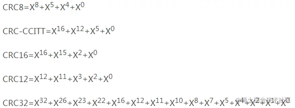 - 生成多项式(generator polynomial):当进行CRC检验时,发送方与接收方需要事先约定一个除数,即生成多项式,一般记作G(x)。生成多项式的最高位与最低位必须是1。常用的CRC码的生成多项式有: