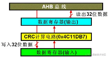 使用这个内置CRC模块的方法非常简单,既首先复位CRC模块(设置CRC_CR=0x01),这个操作把CRC计算的余数初始化为0xFFFFFFFF;然后把要计算的数据按每32位分割为一组数据字,并逐个地把这组数据字写入CRC_DR寄存器(既下图中的绿色框),写完所有的数据字后,就可以从CRC_DR寄存器(既下图中的兰色框)读出计算的结果。
