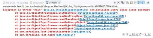 接着我们更改serialVersionUID = 123456789L。然后再反序列化,就可以看到如下的错误了。同时也验证了序列化和反序列化需要版本一致的问题。