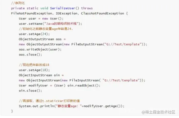 下面这个例子,主要是在对静态变量序列化之后,然后更改静态变量age的值,再重新反序列化输出一下。结果会出现两种情况: