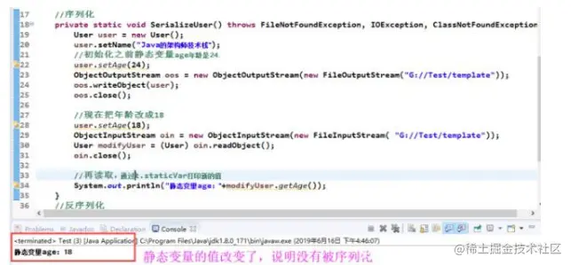 首先需要说一下,静态变量不会被序列化。因为静态变量在全局区,本来流里面就没有写入静态变量,我打印静态变量当然会去全局区查找,当我write read 同时使用时,内存中的静态变量变了。