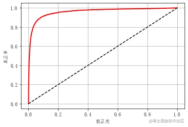 在二元分类器中还有一个经常使用的工具,叫受试者工作特征(receiver operating characteristic,简称ROC)曲线,他与之前的提到的精度/召回率(PR)曲线非常相似,不过是绘制的是真正类率(召回率)和假正率(FPR)。