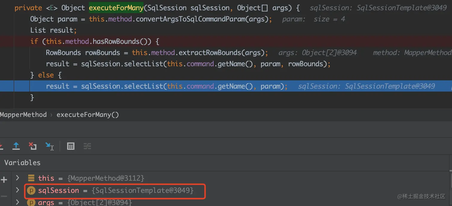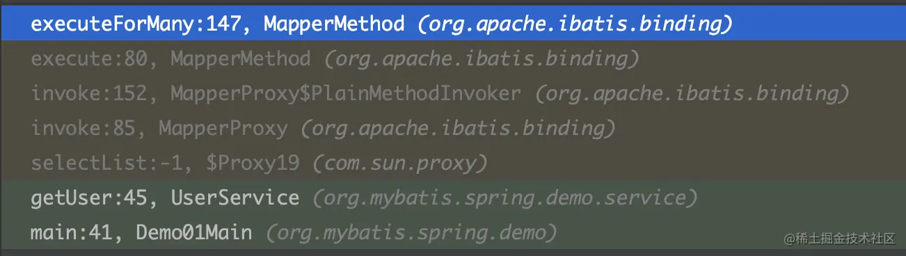 在userMapper.selectList(...)的调用过程中,经过一系列的调用栈后,最终会来到MapperMethod#executeForMany方法: