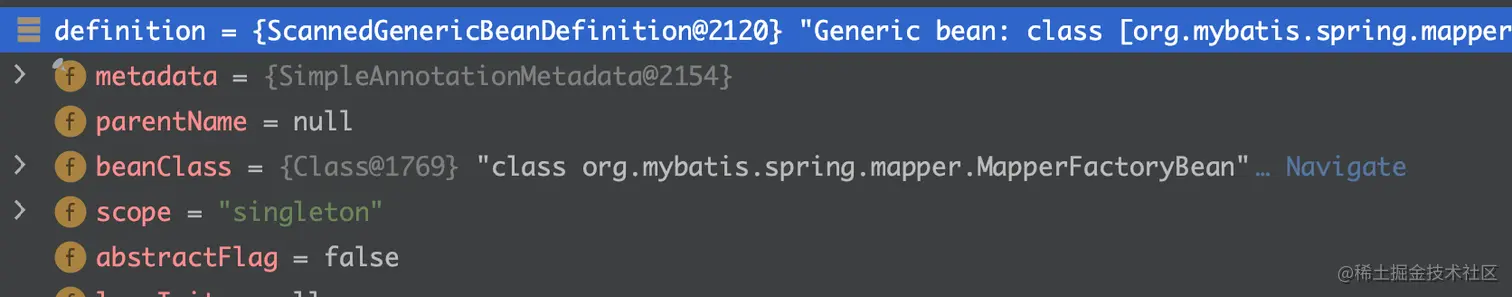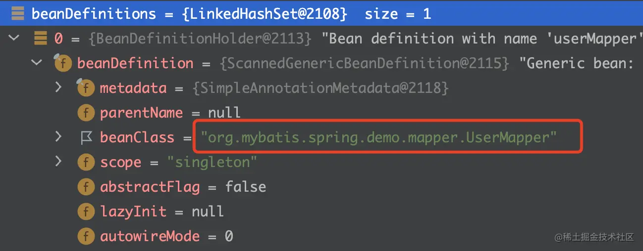 beanDefinition的beanClass为接口,mybatis会在ClassPathMapperScanner#processBeanDefinitions中把beanDefinition的beanClass转换为MapperFactoryBean,这是个FactoryBean,实际的类型为MapperInterface; - 要注入