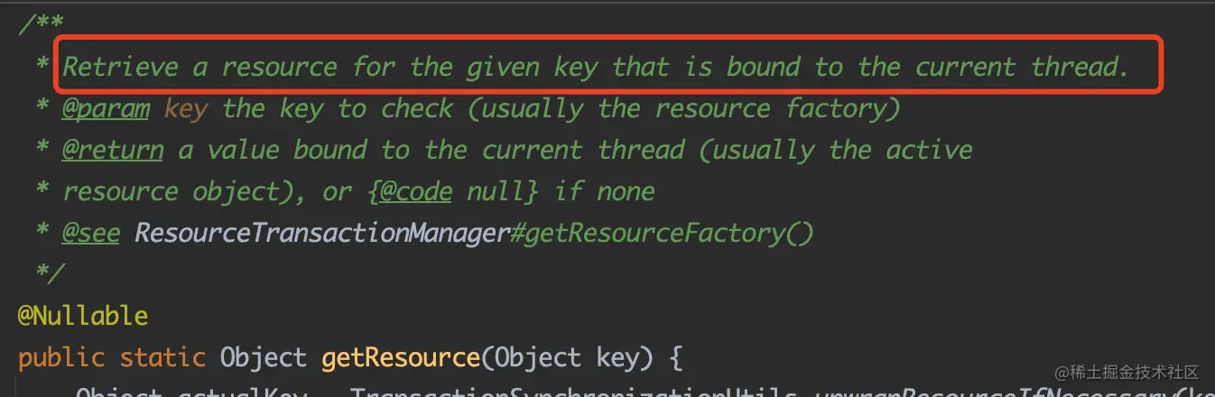 从代码来看,SqlSession是由TransactionSynchronizationManager.getResource(...)获取的,获取不到时才会新建。获取到的SqlSession是所有线程共享的,还是一个线程独占的呢?关于TransactionSynchronizationManager.getResource(...),本文并不打算分析,我们直接看它的方法说明: