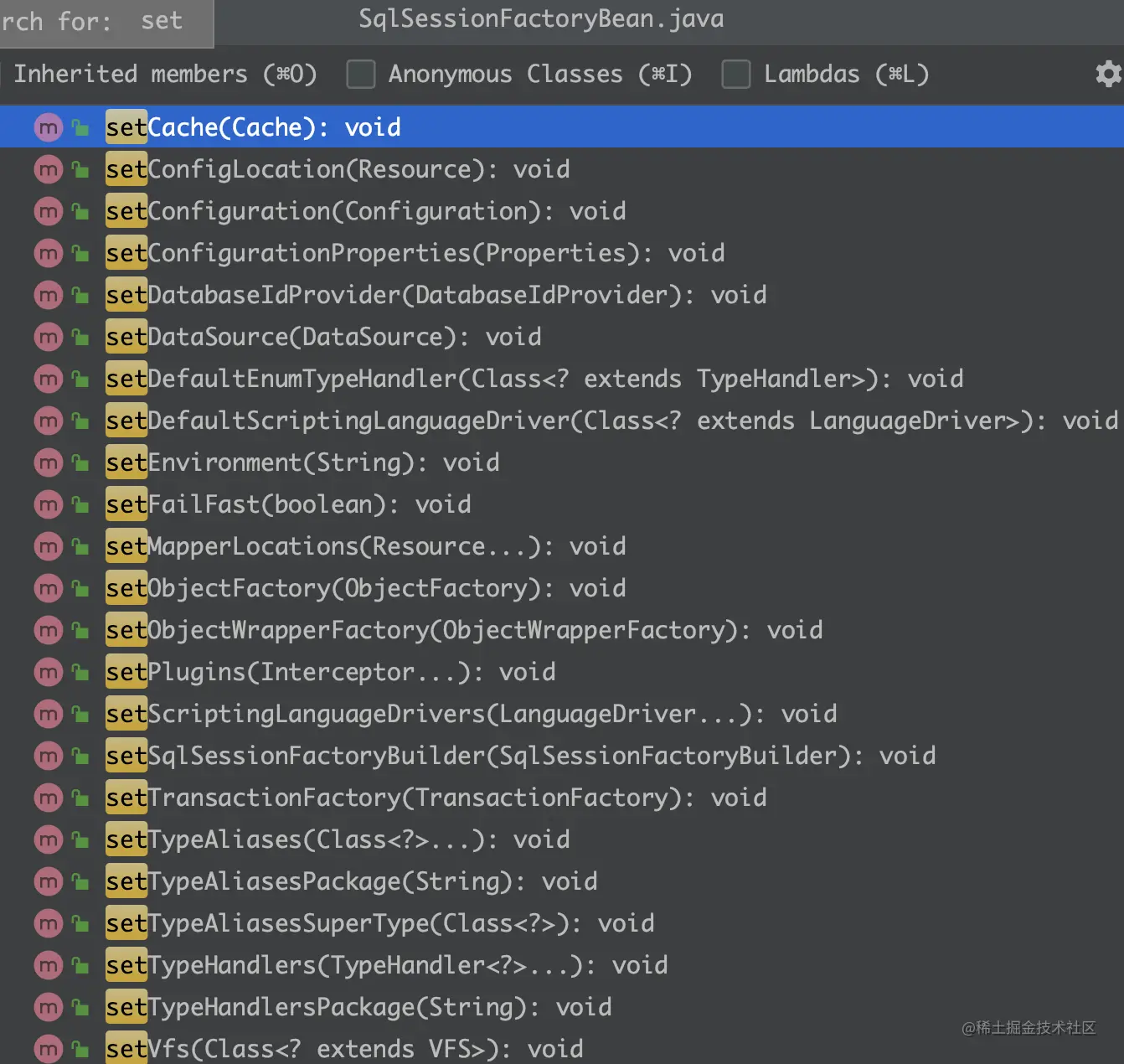 spring 会先获取到setSqlSessionFactory(...)方法,然后获知其参数类型为SqlSessionFactory,接着就从spring容器中找到SqlSessionFactory类型的bean,这个bean我们在Demo01Config已经创建了: