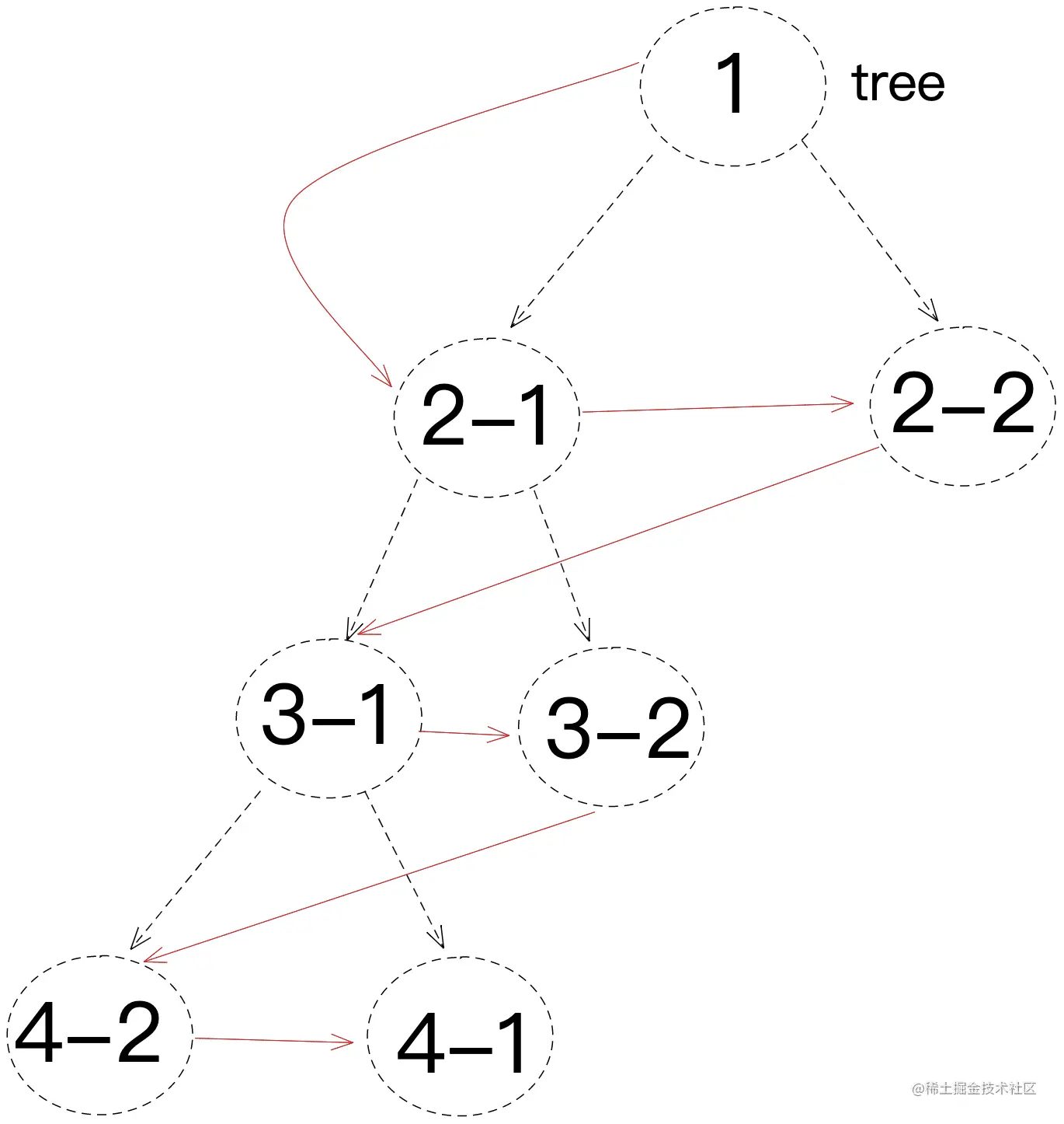 搜索树分支时,从根节点开始,当访问子节点时,先遍历找到兄弟节点,再寻找对应自己的子节点