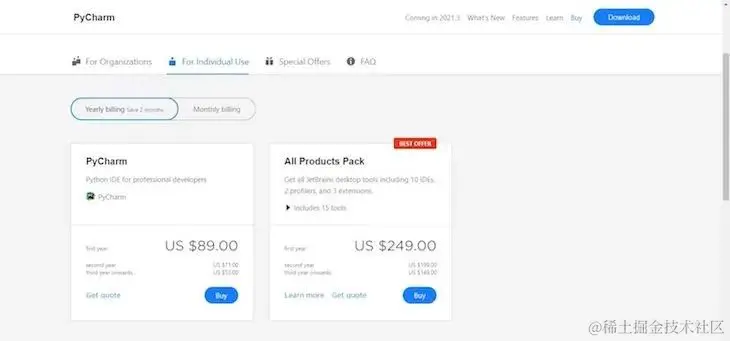 JetBrain的PyCharm有三个版本,其中,个人专业版第一年的费用为89美元,第二年为71美元,第三年起为53美元。组织的专业版第一年的费用为199美元,第二年为159美元,随后几年为119美元。