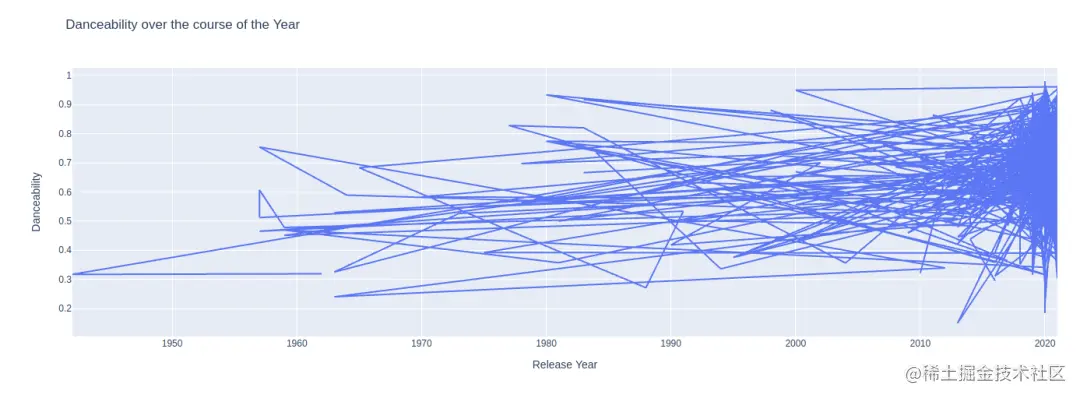 px.line(x='Release Year', y='Danceability', data_frame=df, title="Danceability over the course of the Year")