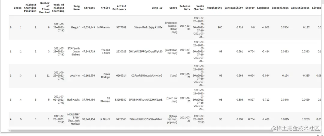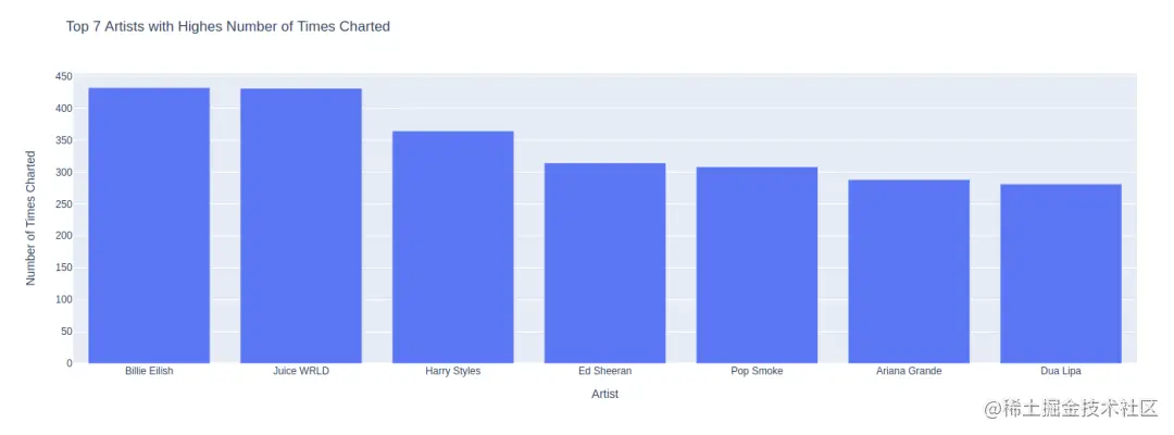 Billie Elish在上榜次数最多的名单中名列前茅。上面的柱状图只有前7名歌手,你可以查看前10名或更多艺术家的情况,只要试着玩玩代码就可以了。