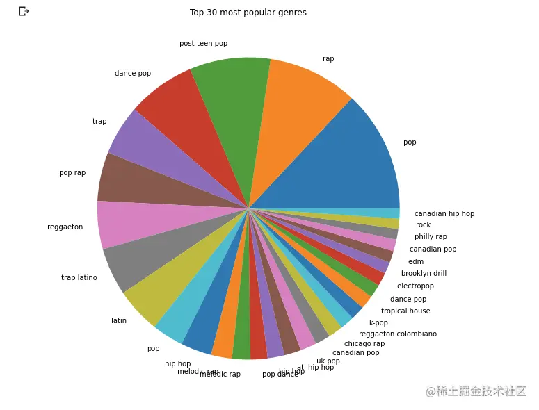 现在简单地绘制30种最受欢迎的流派的饼图: