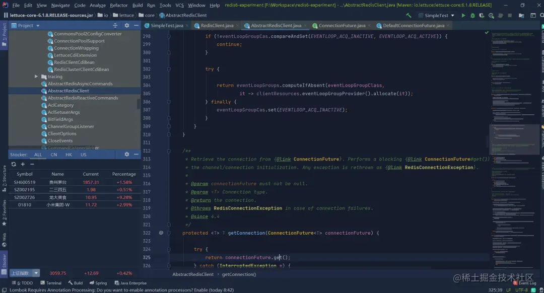 但是一边上班一边盯着手机刷同花顺啥的总是有些不方便,这时候我就要推荐一款 idea 插件 Stocker 了,直接在插件市场里搜索 Stocker 就可以安装了,安装完成后就可以实时关注自选股的蛛丝马迹动向了。