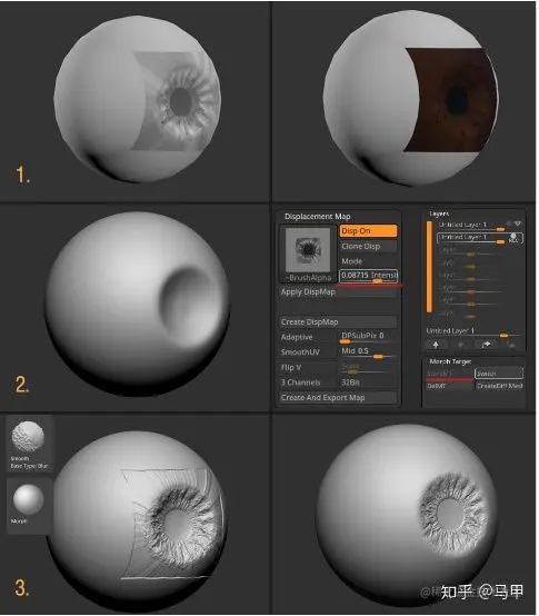 虹膜部分可以通过置换贴图来实现,如图所示: