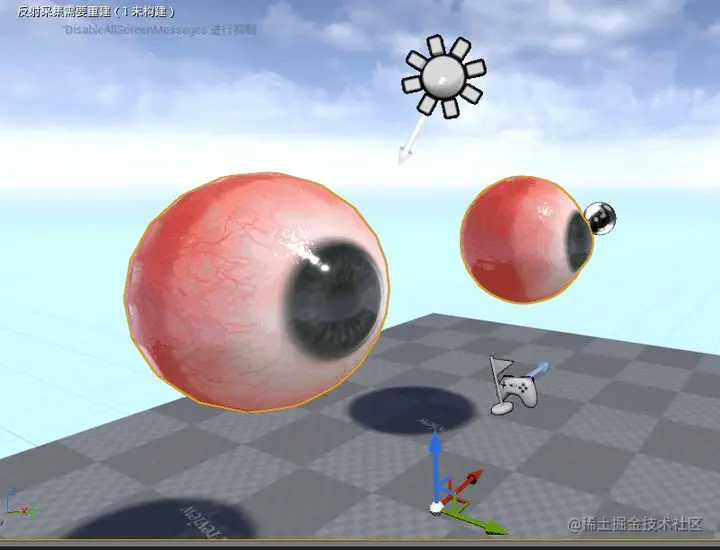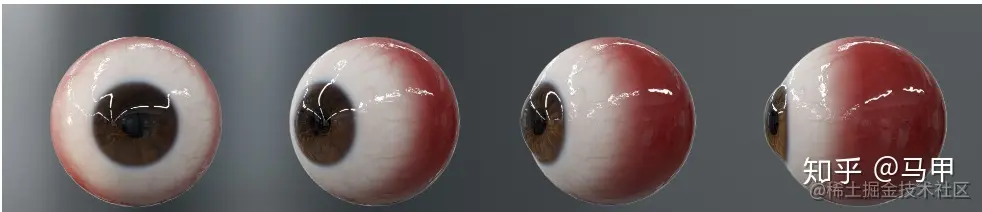 恰巧我们要制作的眼球就是曲面的球体,得出的结果美术们肯定不满意,连我自己这关都过不了,所以就去各大成熟渲染引擎偷师了一下,发现 Marmoset 这款引擎对眼球的折射处理的非常好,如下所示: