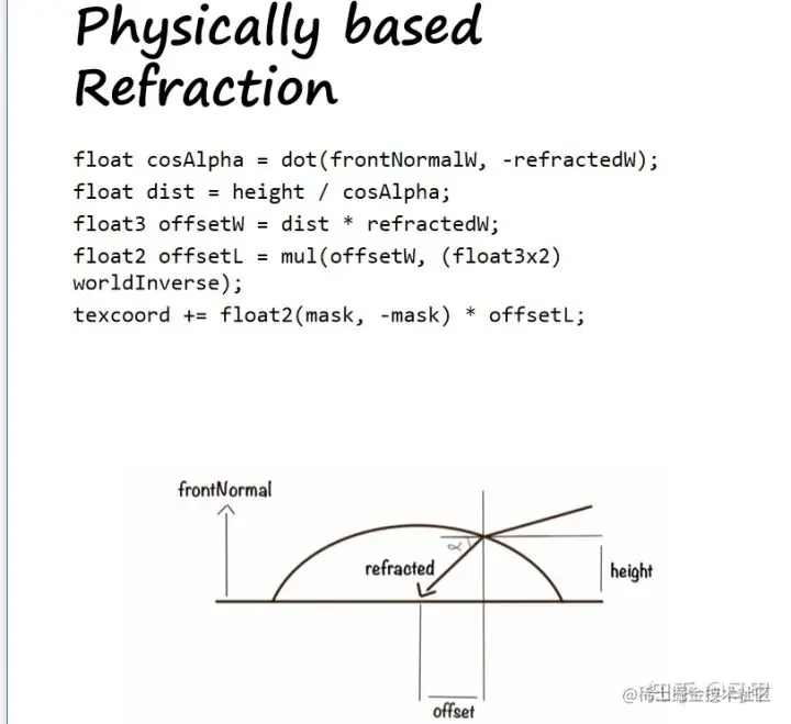 有兴趣的可以看看,没兴趣的直接把公式拿来用,我属于后者。资料已经准备全了,接下来开始计算,首先 refractedW 的计算直接拿快速拟合的折射公式来进行推导,除了 L 部分其他都一模一样。