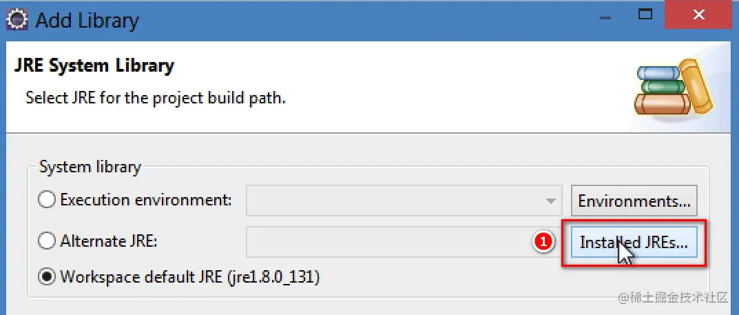 步骤4:在弹出的“Add Library”对话框中点击“Installed JREs”按钮