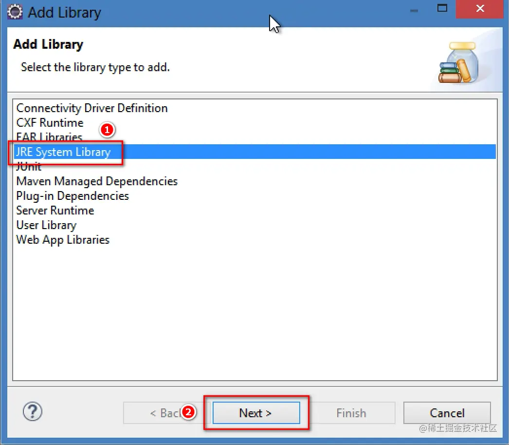 步骤3:在弹出的“Add Library”对话框中选择“JRE System Library”选项,并点击下方的“Next”按钮