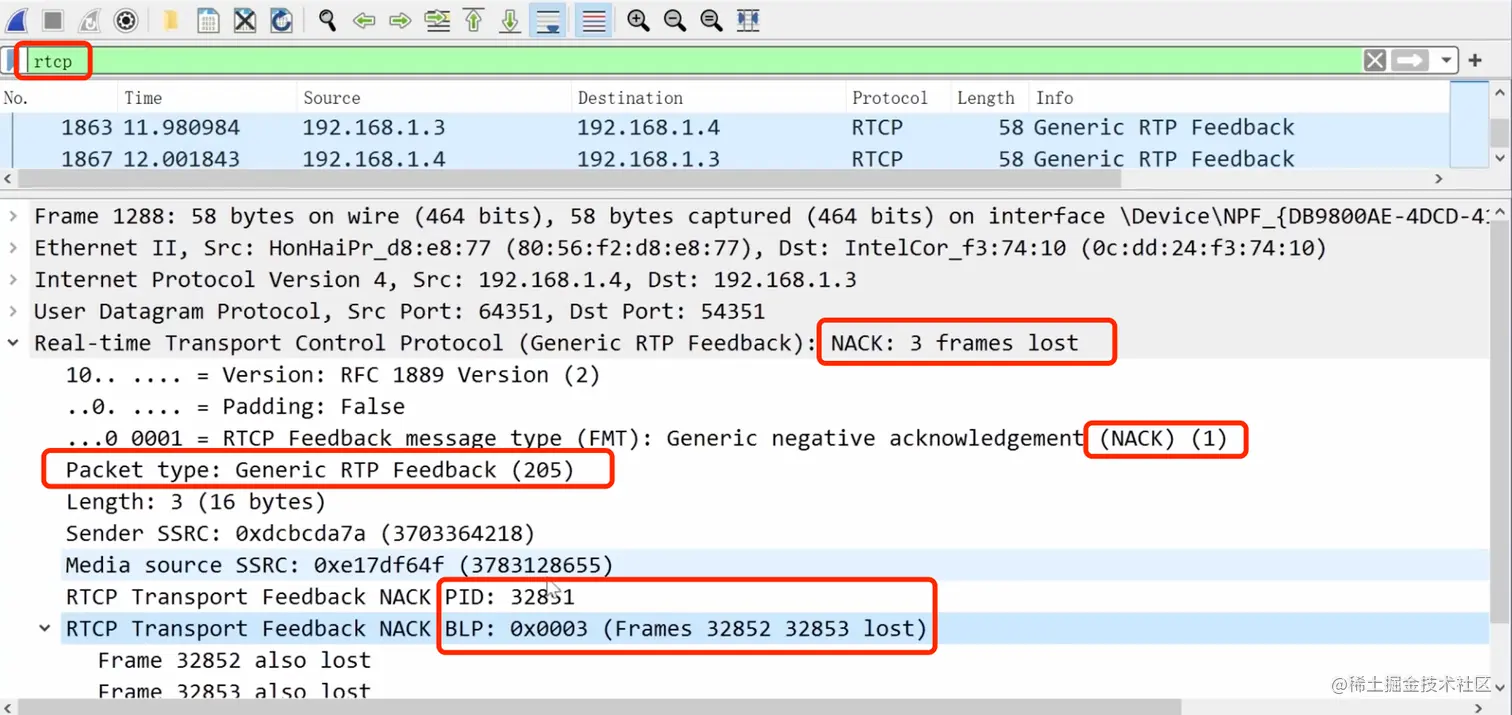 通过过滤RTCP消息, 抓取RTP Feedback的消息, 其中找到FMT为1的nack消息