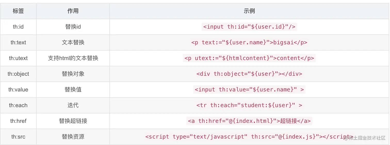 咱们上面知道Thymeleaf通过特殊的标签来寻找属于Thymeleaf的部分,并渲染该部分内容,而除了上面展示过的th:text之外还有很多常用标签,并且Thymeleaf也主要通过标签来识别替换对应位置内容,Thymeleaf标签有很多很多,功能也很丰富,这里列举一些比较常用的标签如下: