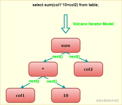 下面先来说说Volcano Iterator Model(火山迭代模型)到底是什么。在这种模型中,一个查询会包含多个operator,每个operator都会实现一个接口,提供一个next()方法,该方法返回operator tree中的下一个operator。