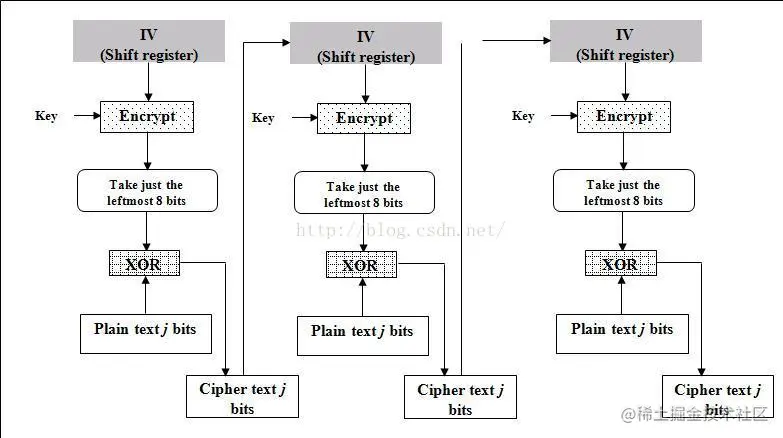 密文反馈(CFB,Cipher feedback)模式类似于CBC,可以将块密码变为自同步的流密码;工作过程亦非常相似,CFB的解密过程几乎就是颠倒的CBC的加密过程: 需要使用一个与块的大小相同的移位寄存器,并用IV将寄存器初始化。然后,将寄存器内容使用块密码加密,然后将结果的最高x位与平文的x进行异或,以产生密文的x位。下一步将生成的x位密文移入寄存器中,并对下面的x位平文重复这一过程。解密过程与加密过程相似,以IV开始,对寄存器加密,将结果的高x与密文异或,产生x位平文,再将密文的下面x位移入寄存器。 与CBC相似,平文的改变会影响接下来所有的密文,因此加密过程不能并行化;而同样的,与CBC类似,解密过程是可以并行化的。