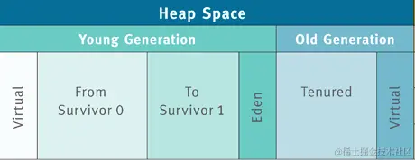 Java 堆根据对象存活时间的不同,Java 堆还被分为年轻代、老年代两个区域,年轻代还被进一步划分为 Eden 区、From Survivor 0、To Survivor 1 区。如下图所示。