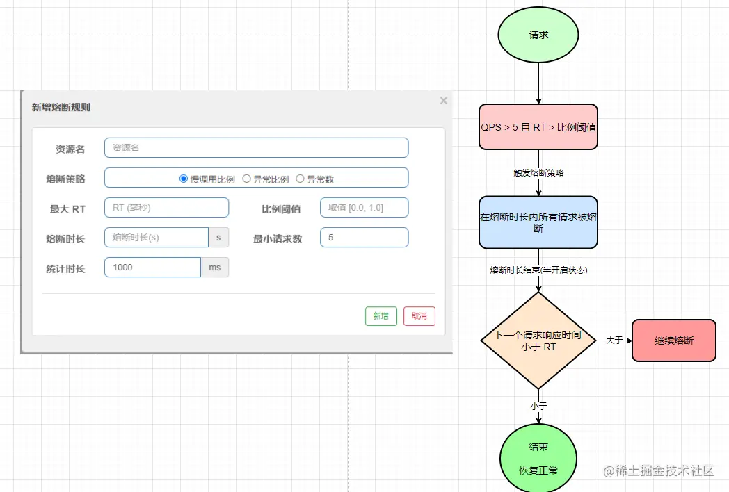 选择以慢调用比例作为阈值,需要设置允许的慢调用RT(最大响应时间),如果请求响应时间大于该值则认为慢调用,当统计时长内请求数 大于 最小请求数,且慢调用比例大于阈值,在熔断时长内的请求会被自动熔断,超过熔断时长进入半恢复状态(HALF_OPEN),如果下一个请求响应时间 小于 慢调用比例RT结束熔断,否则再次熔断。