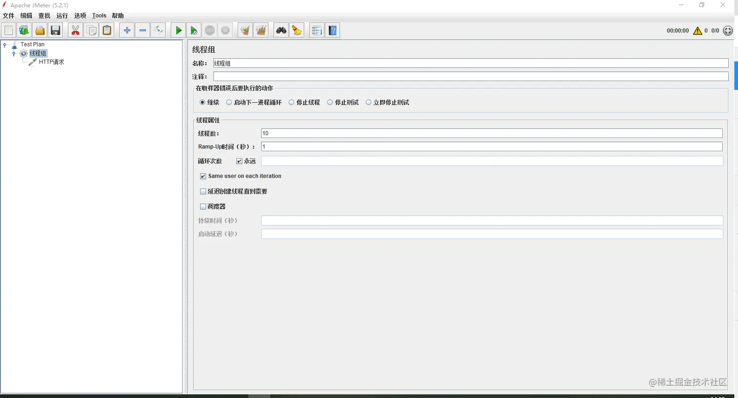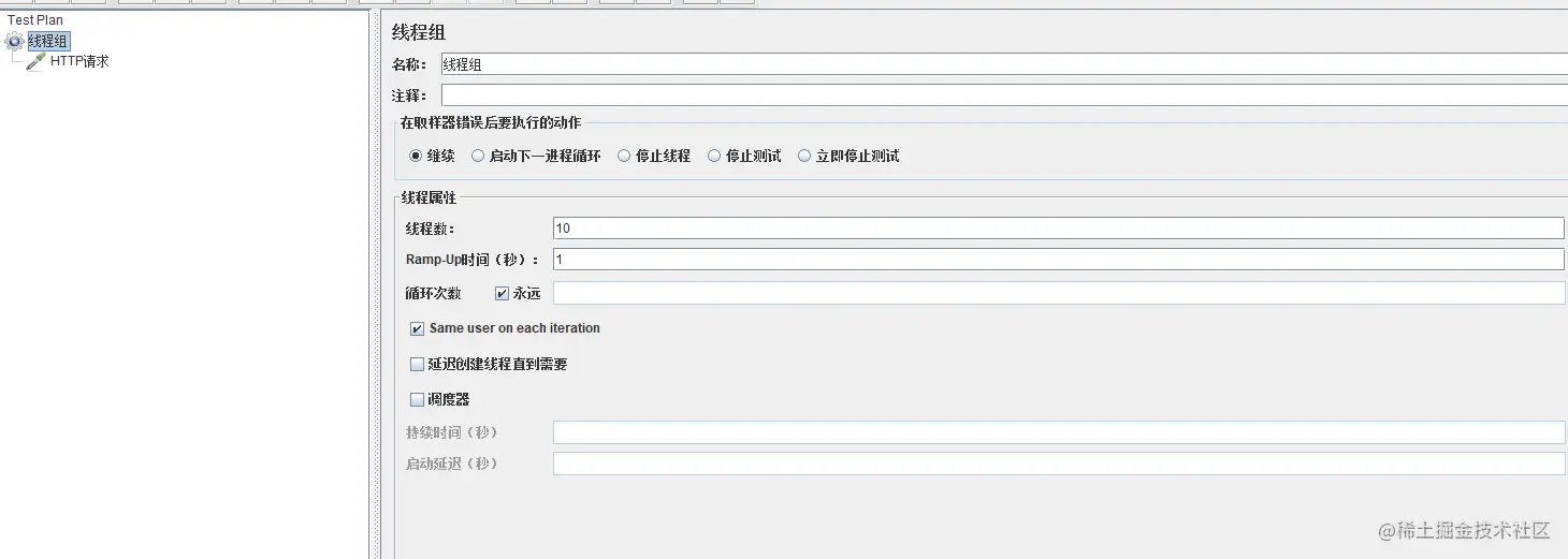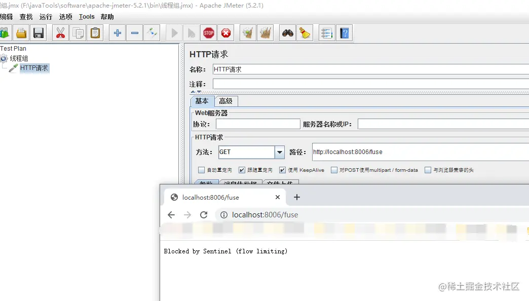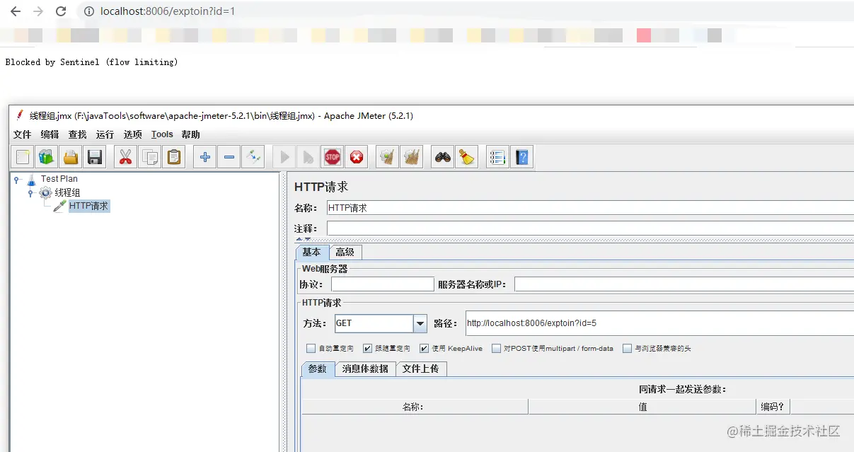 接下来我们用JMeter进行测试,设置Http请求地址:http://localhost:8006/exptoin?id=5 当启动JMeter的时候,会触发熔断,这个时候我们1秒钟发送10个请求超过了最小请求数,同事超过了阈值,满足两个条件,当熔断时间结束 以后恢复正常