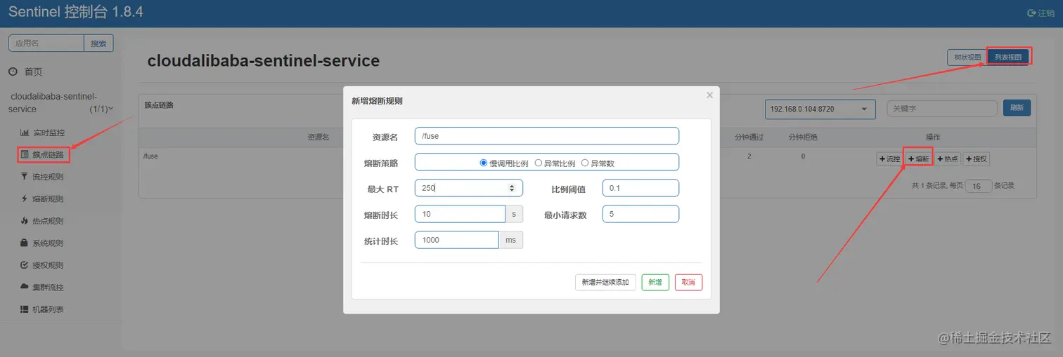 设置我们的熔断策略,如果QPS>5请求RT>250且大于比例阈值触发熔断