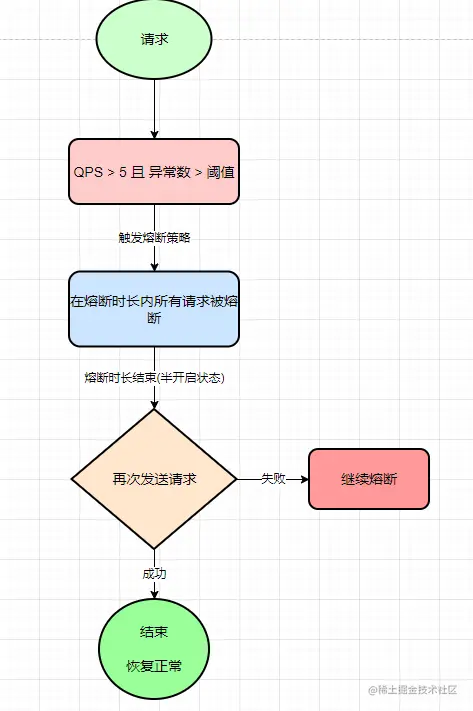 当统计时长内异常数 大于 阈值,自动进行熔断,超过熔断时长进入半恢复状态(HALF_OPEN),如果下一个请求成功,结束熔断,否则再次熔断。