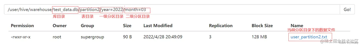 hive> load data local inpath '/usr/local/wyh/test_data/user_partition2.txt' into table partition2 partition(year='2022',month='03');