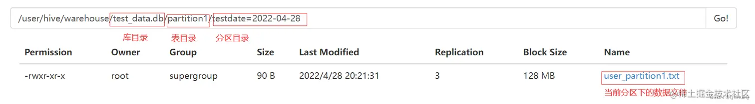 hive> load data local inpath '/usr/local/wyh/test_data/user_partition1.txt' into table partition1 partition(testdate='2022-04-28');