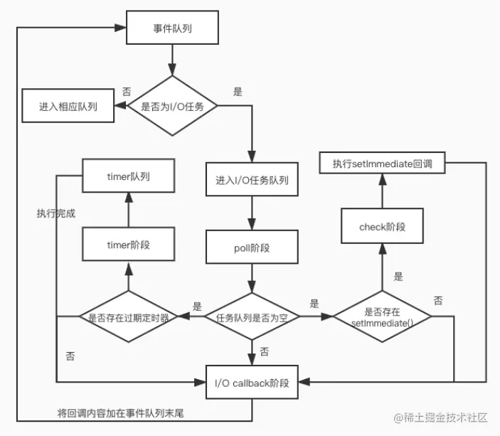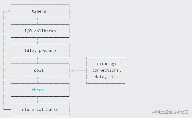 每个阶段对应一个队列,当事件循环进入某个阶段时, 将会在该阶段内执行回调,直到队列耗尽或者回调的最大数量已执行, 那么将进入下一个处理阶段