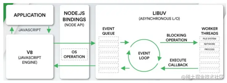 而在NodeJS中,事件循环是基于libuv实现,libuv是一个多平台的专注于异步IO的库,如下图最右侧所示:
