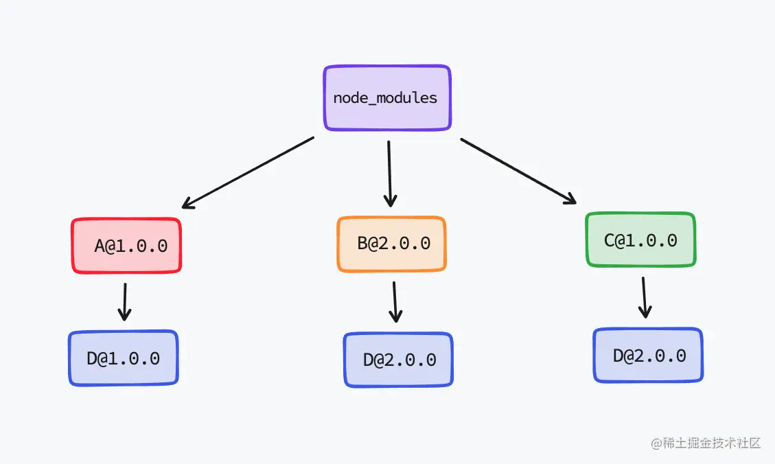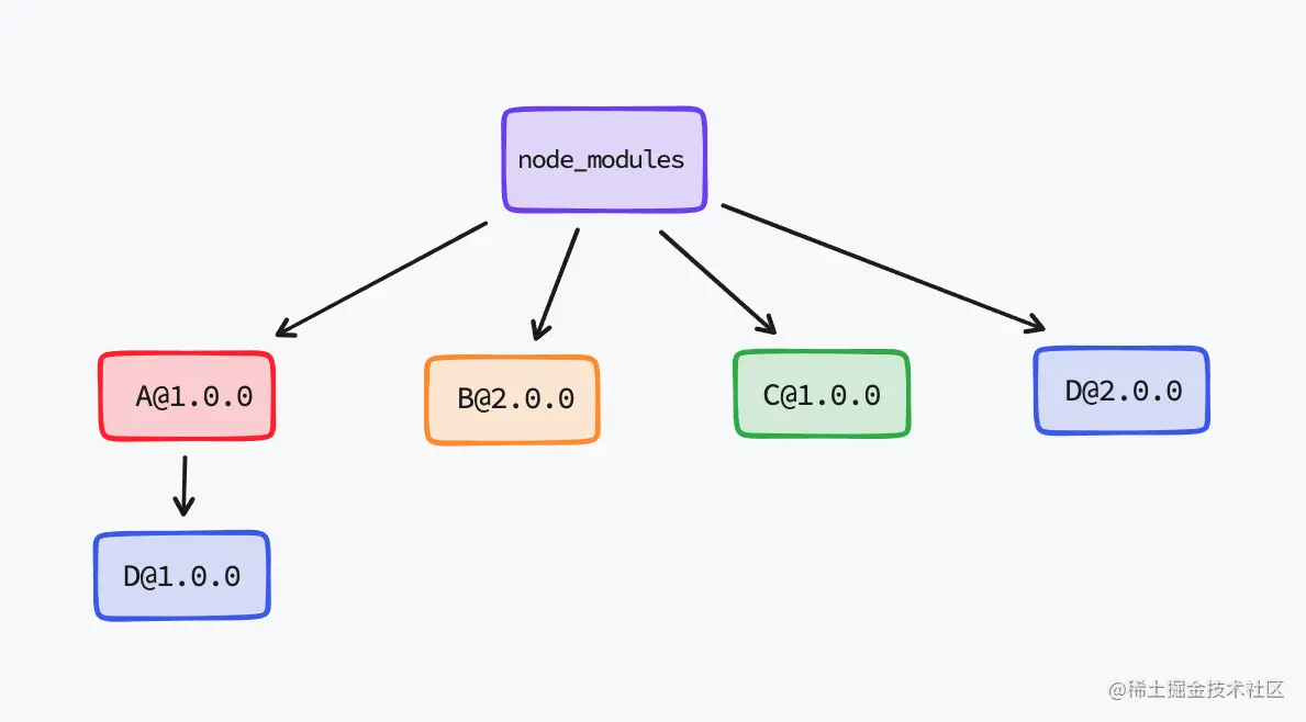 - npm 包分身。同样的也因为打平了 node_modules 中的依赖,就会造成了相同版本的子依赖包在被不同的项目依赖所依赖时会安装两次(即上面的图,B/C 两个包都依赖了 D@2.0.0)
