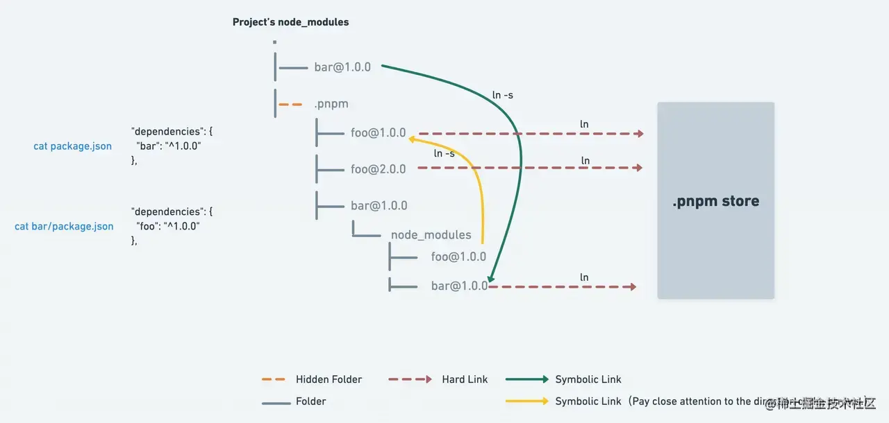 .pnpm/bar@1.0.0/node_modules/bar@1.0.0。.pnpm/bar@1.0.0/node_modules/bar@1.0.0又通过硬链接指向 Store -