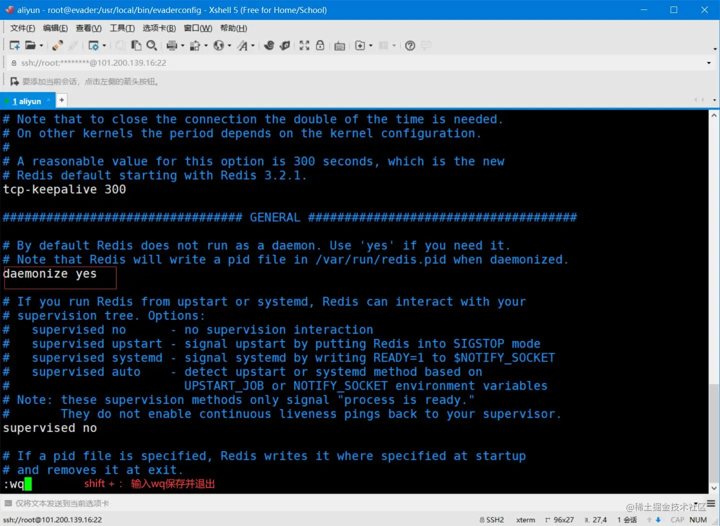 - redis默认不是后台启动的,需要改下配置文件 首先i进入编辑模式,将no改成yes。输入:进入底部命令模式,输入wq保存退出