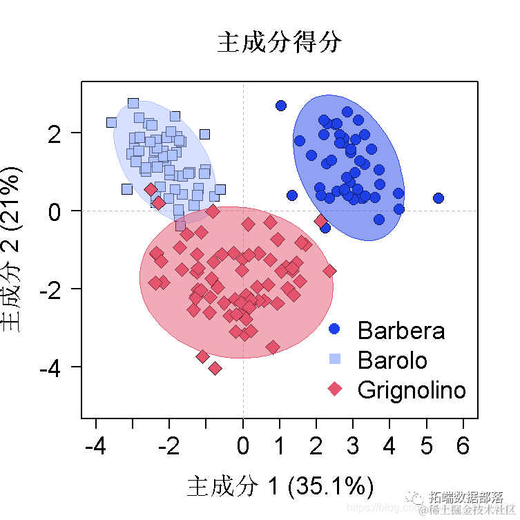 此外,我们还可以在分数图中的组别上添加95%的置信度椭圆。