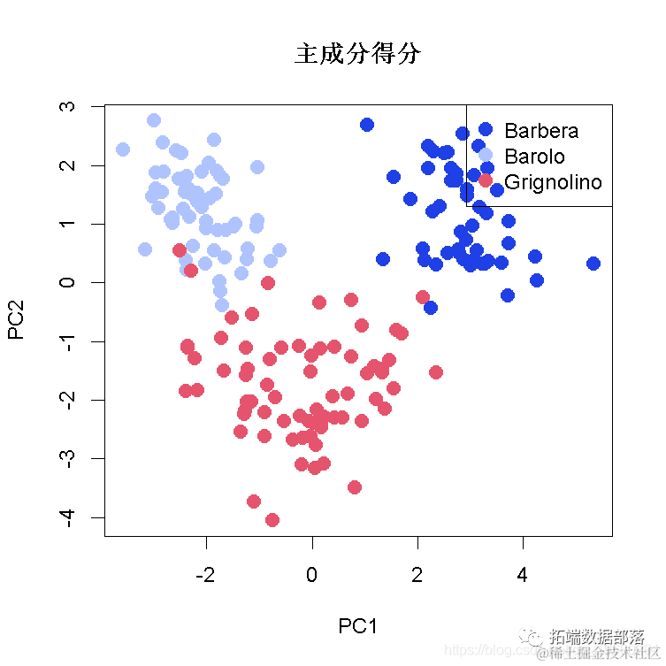 plot(scores\[,1\], # X轴的数据