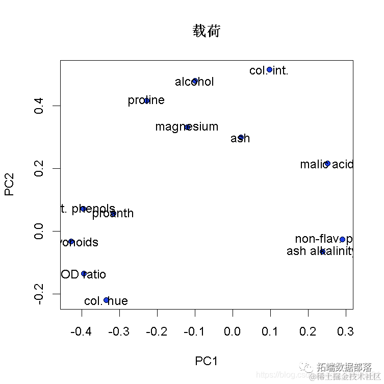 plot(loadings\[,1:2\], # x和y数据