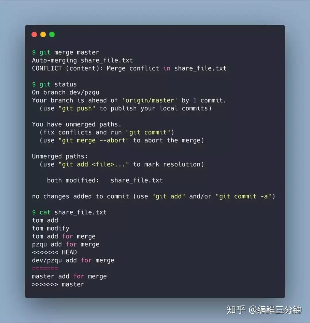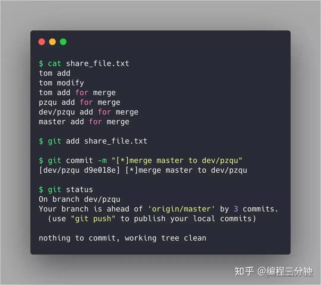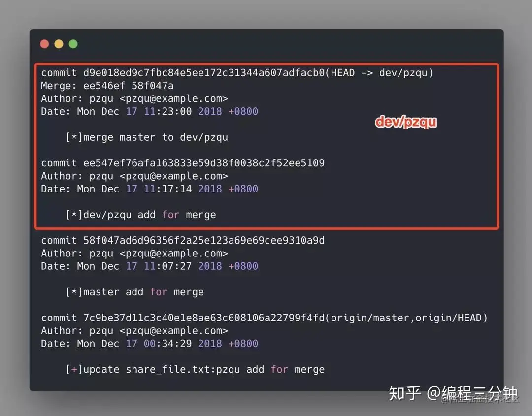 切换到dev/pzqu分支,向share_file.txt加入一行dev/pzqu add for merge并提交,现在share_file.txt内容如下: