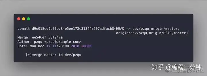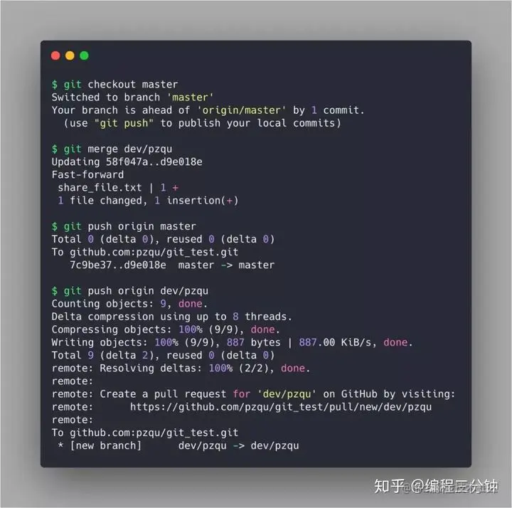 master分支比远程origin/master分支多一次提交,dev/pzqu分支由于是基于origin/master分支,合并了master分支的提交和当前dev/pzqu分支的提交,超出本地master两个提交,致此我们把master合并到dev/pzqu的操作就完成了。- 通常我们开一个新的开发分支是为了在自己的分支上写代码,方便提交也不会把主线弄乱。