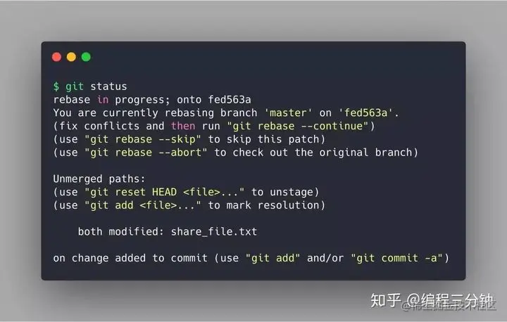 - 一般rebase或pull冲突的时候,都会出现提示,然后git status会出现上图图示