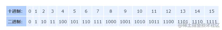 二进制中的数字 0 到 15:
